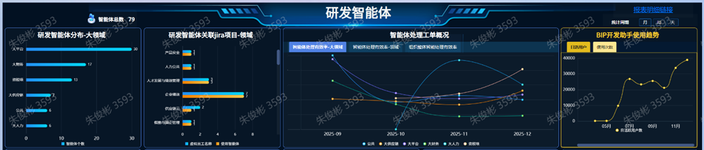 这些研发智能体涵盖30+个业务领域,由46名AI知识官运营管理,对BIP产品的覆盖度接近90%;其中使用次数位居前三位的分别是:BIP大财务数智与架构-工单运维-产品助理,BIP供应链云-产品助理,BIP智能会计-财务会计-产品助理。