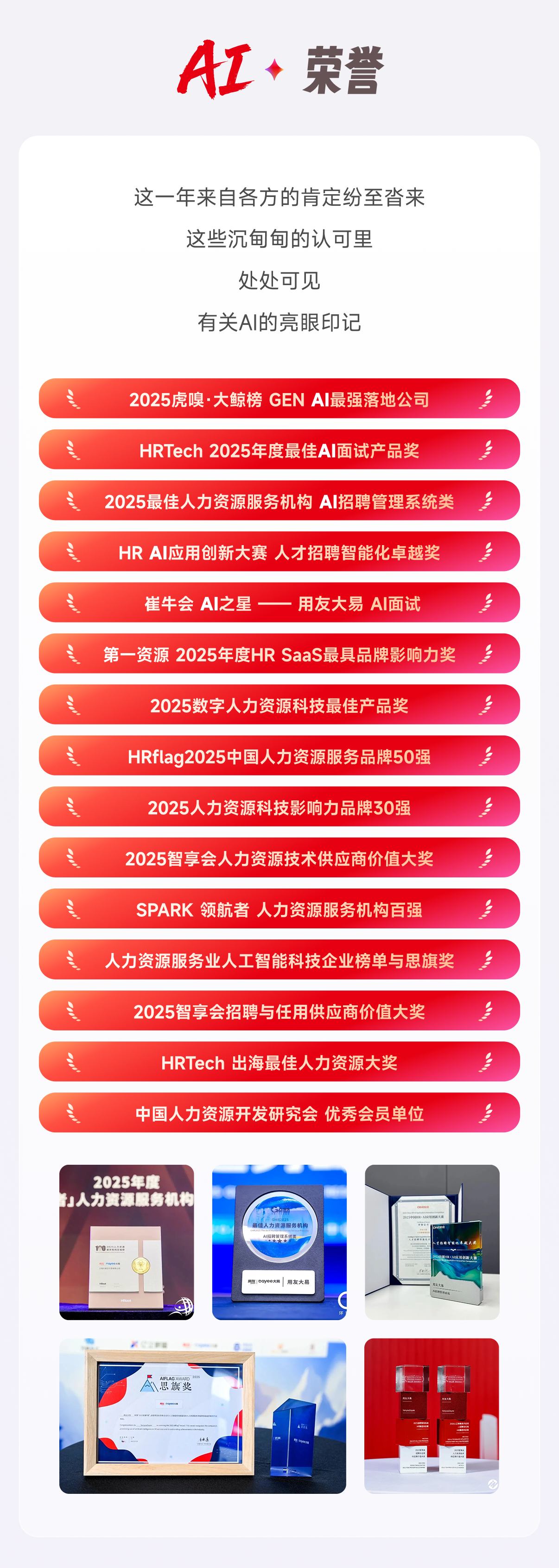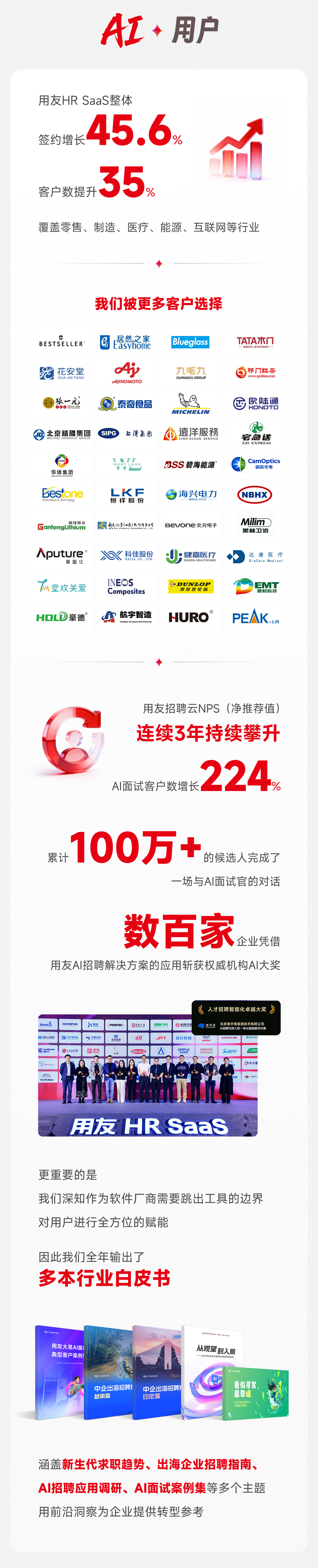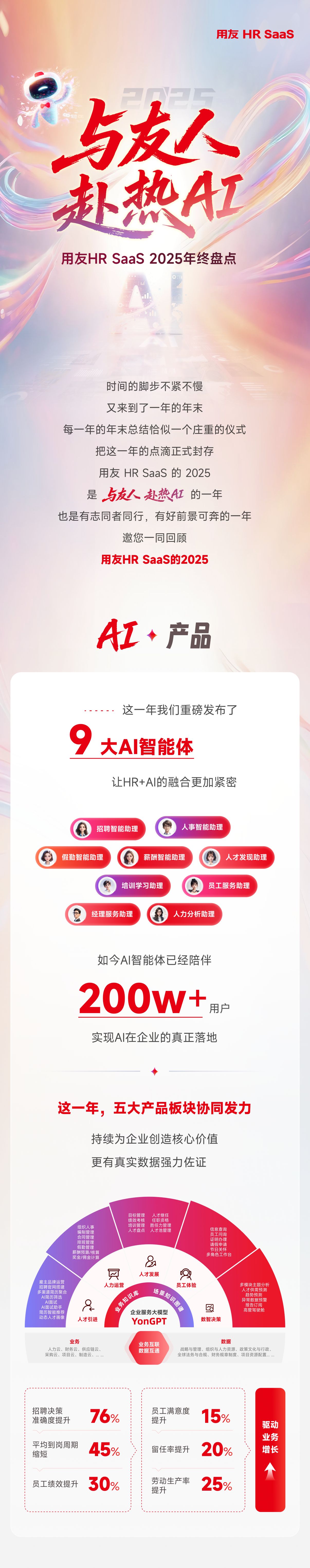 2025年是AI 技术深度落地人力资源赛道的一年,在 2025年年尾,用友 HR SaaS 以 “与友人赴热 AI” 为初心,交出了一份硬核答卷。这一年,产品端重磅发布9大AI智能体,覆盖招聘、人事、薪酬等全场景,为200w+ 用户带来效率革命 —— 招聘决策准确率提升76%、到岗周期缩短45%,更驱动员工绩效与劳动生产率显著增长。市场端持续爆发,签约增长45.6%、客户数提升35%,AI面试服务吸引100 万 + 候选人参与。