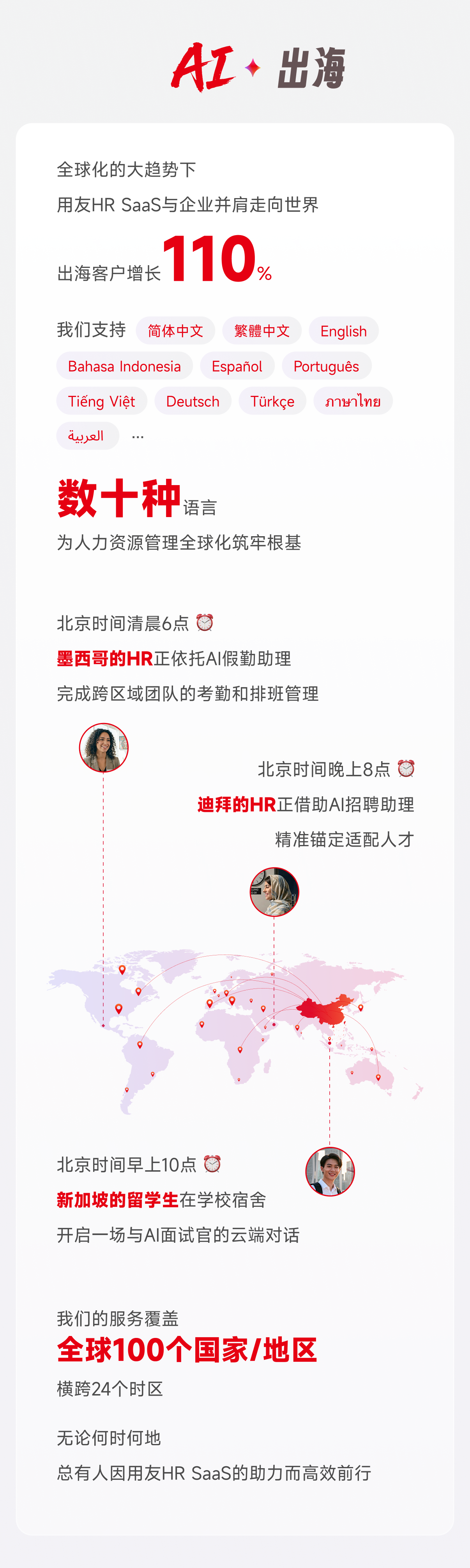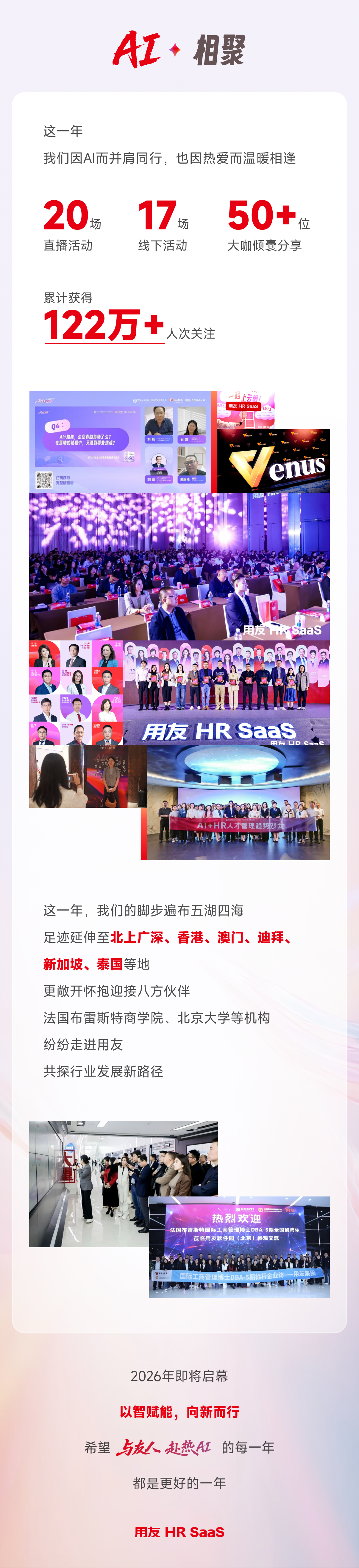 除此之外,用友HR SaaS全球化布局再提速,出海客户增长110%,以数十种语言服务全球100个国家 / 地区的用户。行业认可接踵而至,15项权威奖项见证AI落地实力,20场直播、17场线下活动汇聚50+大咖,收获122 万+人次关注。从产品创新到生态共建,从国内深耕到全球拓展,用友 HR SaaS 用AI重构人力价值,2026 年更将以智赋能、向新而行,续写行业新篇。