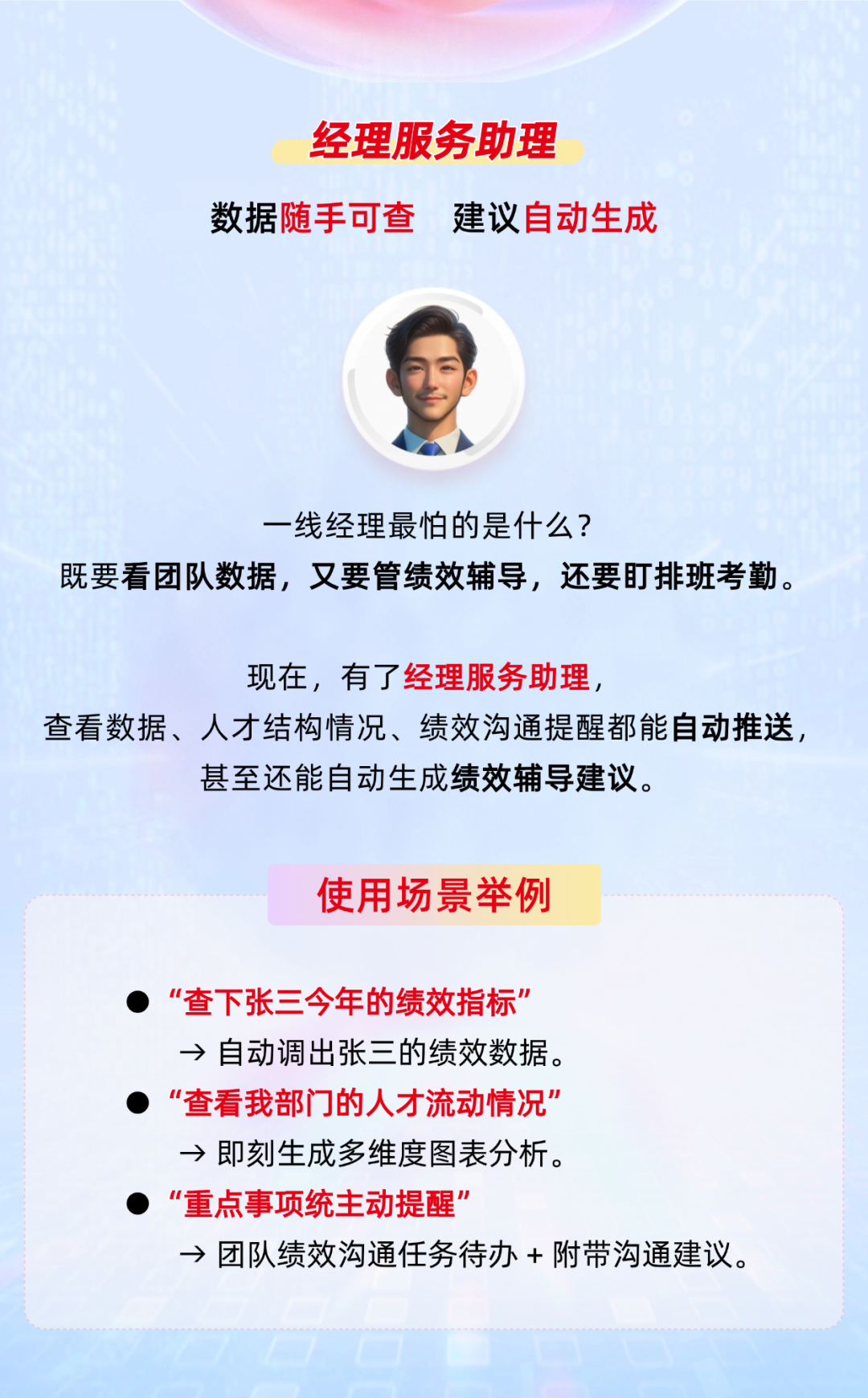自然语言提问,智能生成报告和图表,洞察人才结构与流动趋势。不管你是员工、经理、高管还是HR,都能找到专属的“智能搭档”。