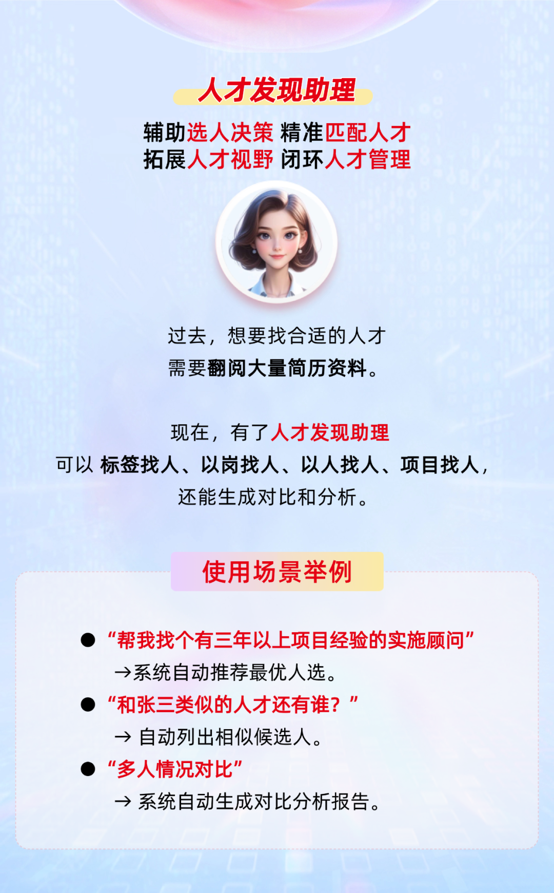 依托大模型、智能搜索引擎与自然语言处理技术,精准解析企业人才需求,通过标签找人、以岗找人、项目找人,推荐最合适的人选,还能自动生成分析与对比。