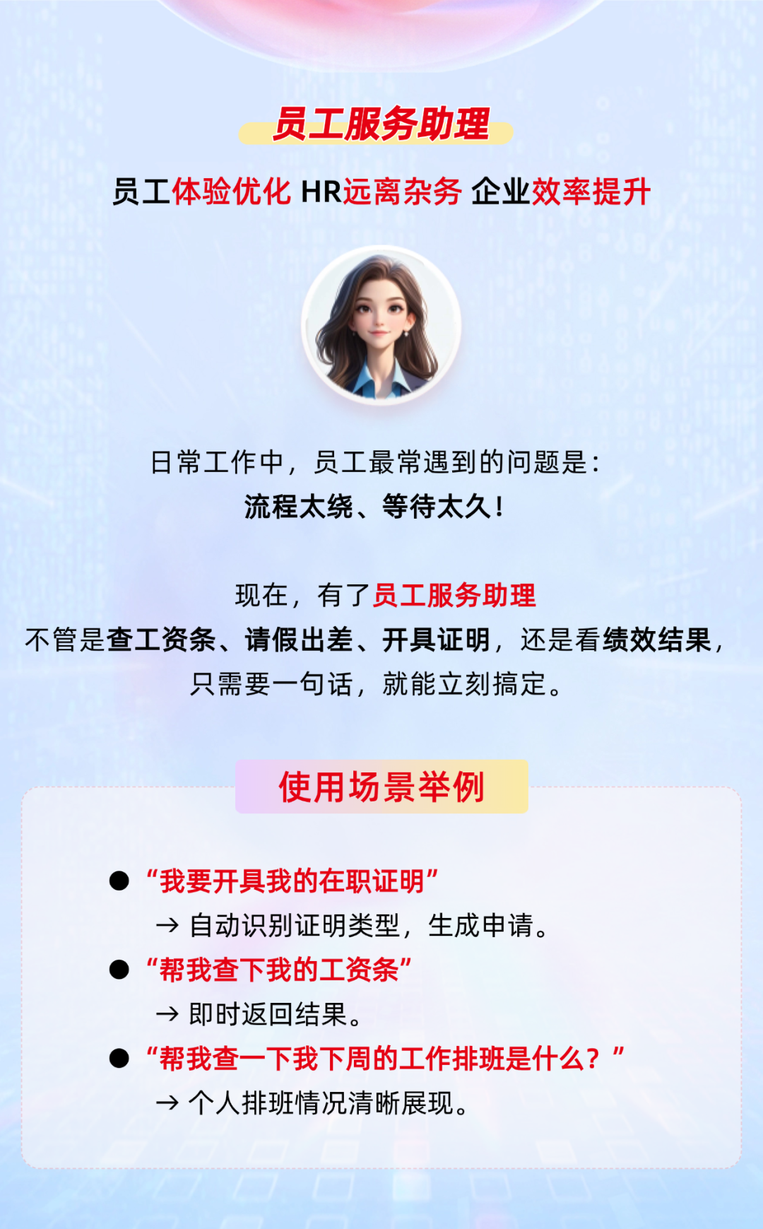 全天候在线,帮员工搞定入职、请假、工资条、绩效结果等常见事务全面优化员工体验,解放 HR 事务性负担,提升企业整体效率。