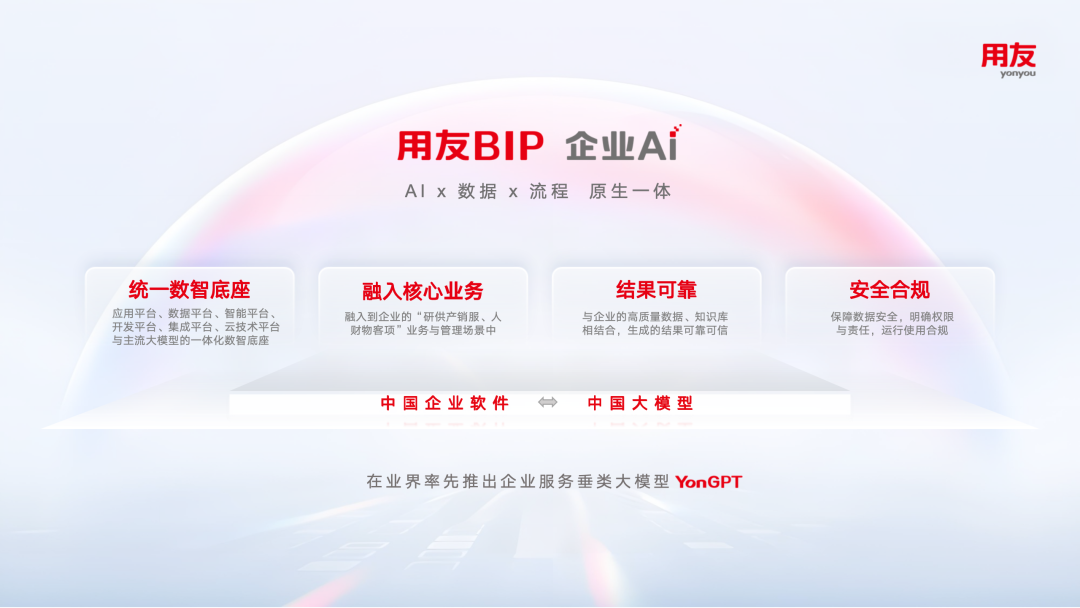8月16日,用友重磅发布了里程碑新品——用友BIP 5,用友BIP 企业AI 作为此次发布的重大突破创新,用友BIP企业AI 聚焦“AI×数据×流程”原生一体的核心能力,具有统一数智底座、融入核心业务、结果可靠、安全合规的四大特性,让AI在企业管理和运营中真正释放价值,驱动企业的决策与运营数智化升级。