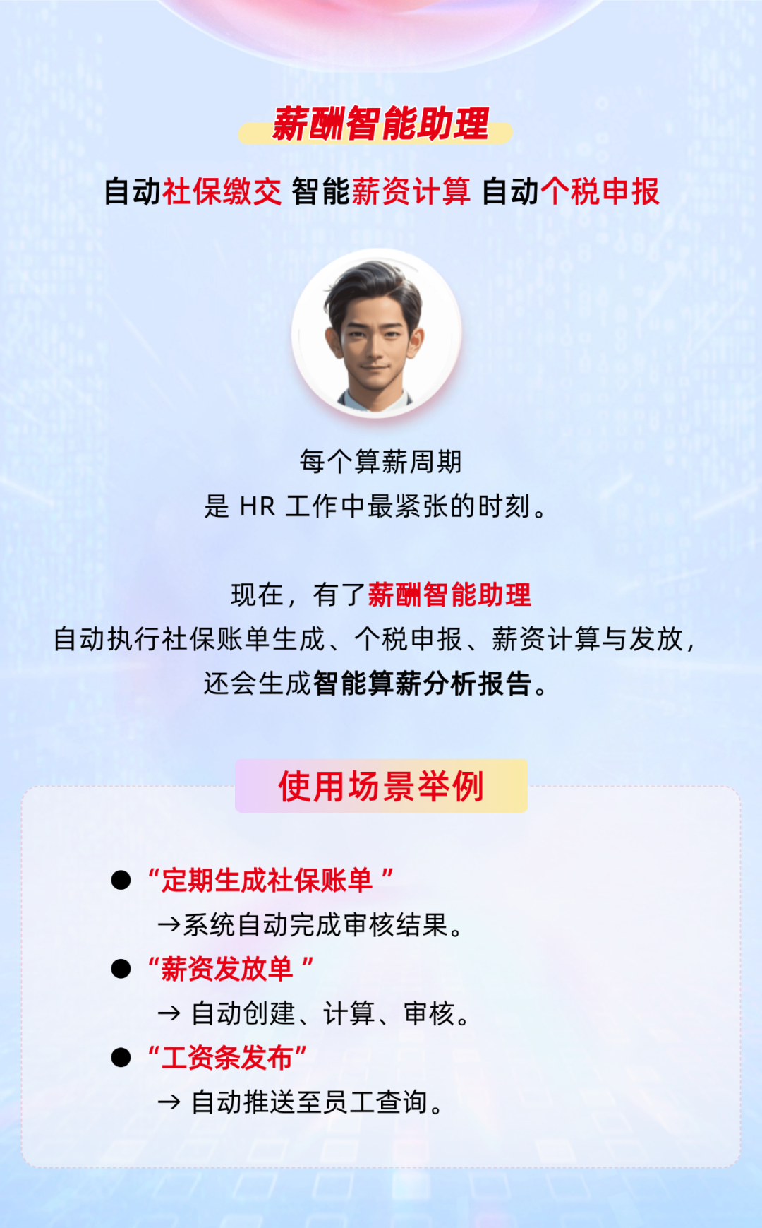 全面实现薪酬管理的全流程自动化与智能化,它以智能算薪中枢为核心,自动算薪、社保账单生成、个税申报,连报盘文件都能一键完成。