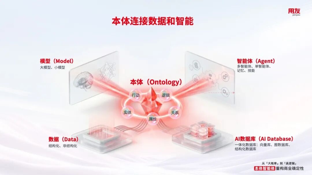 BIP“本体智能体”(Ontology-Driven Agent)植根于用友37年深耕企业服务领域沉淀的行业Know-how,以本体(Ontology)为核心纽带,连接结构化与非结构化数据,打通智能体、模型、数据、AI数据库的协同链路,通过对业务实体、关系、流程与状态变化的全面建模,构建出与真实业务运营实时同步、可交互且动态演进的数字孪生。