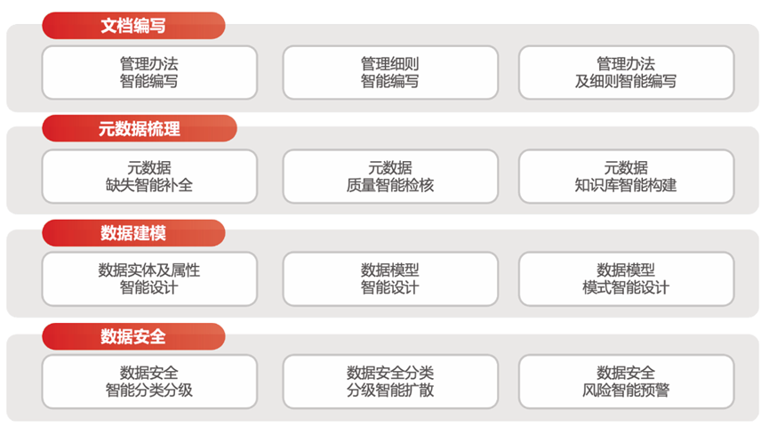 用友BIP数据平台为企业提供了一个集数据整合、处理、治理和可视化于一体的平台, 为AI落地提供了全域数据标准和治理能力。通过“元数据”理清数据家底,从“规则标准化定义”到“质 量自动化稽查”到“异常智能诊断”到“问题根因溯源”到“改进效果追踪”,形成端到端的数据治理链路,驱动数据价值持续释放。此外,数据平台通过基于AI的「数据治理工具箱」提供有覆盖文档编写、元数据梳理、 数据建模、数据安全等四大类场景的多种智能服务,大大降低“数据治理”中“理”所需要的人工工作内容,从AI 与平台工具层面提高数据治理效率。