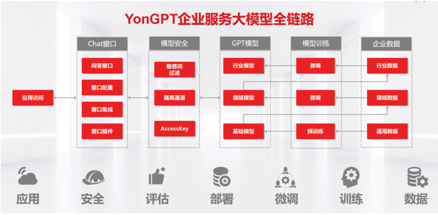 YonGPT的全链路安全管控贯穿七大核心环节:数据、训练、微调、部署、评估、安全、应用。通过多层次、多维度的安全措施,确保模型全生命周期的可靠性与合规性。