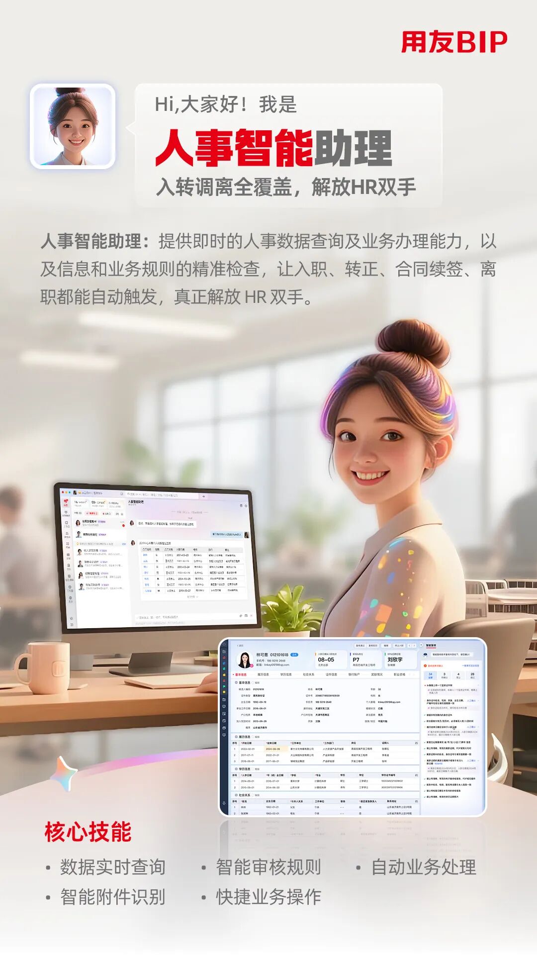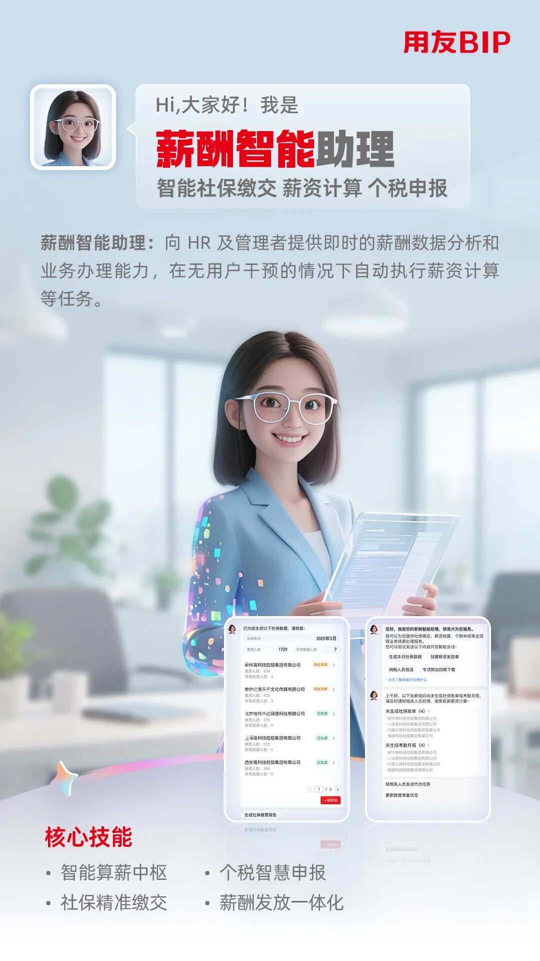 传统 HR 工作中,入转调离的流程繁琐、薪酬核算的误差风险、人才数据的价值沉埋、员工服务的响应滞后等痛点,长期制约着组织效能的提升。基于业务场景、数据价值、交互体验三大核心方向,用友BIP七大人力智能体,正以数智之力打破传统桎梏,让HR从繁杂事务中解放,让人力管理更精准、更高效、更具温度。