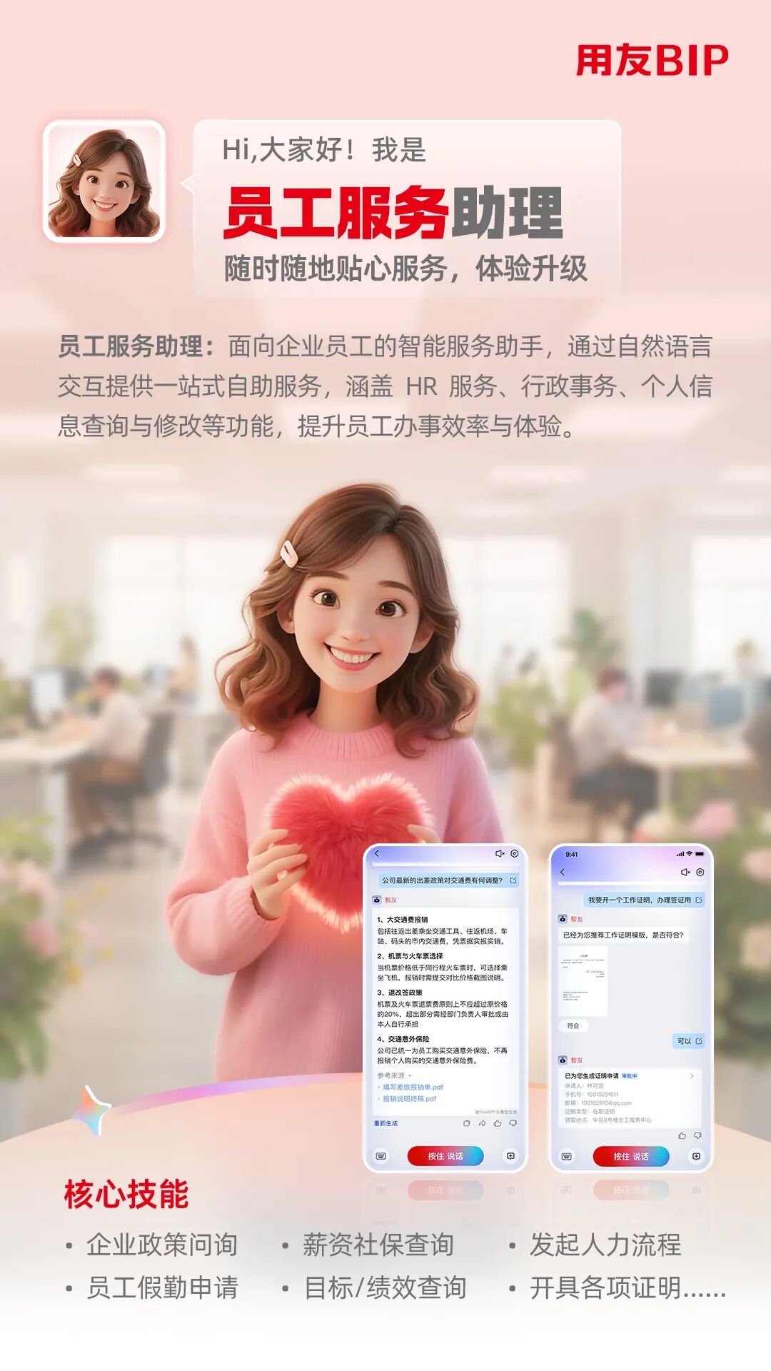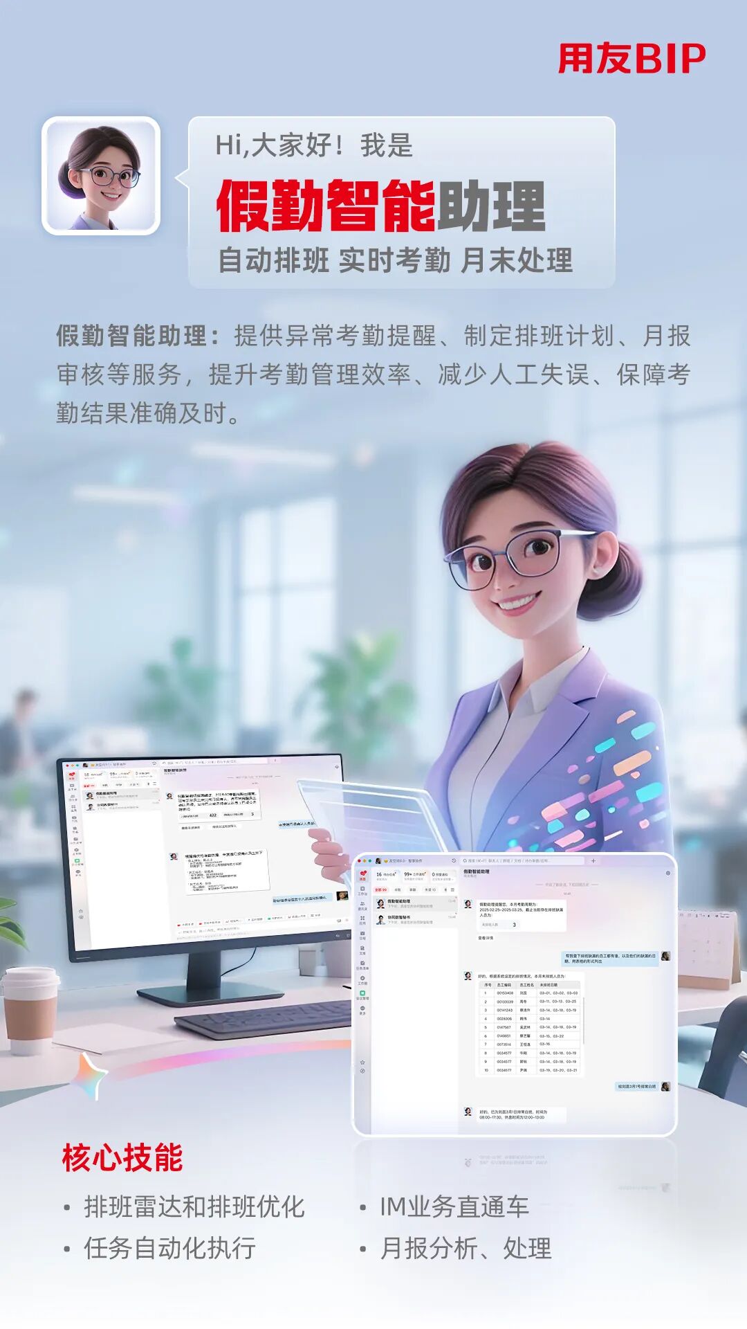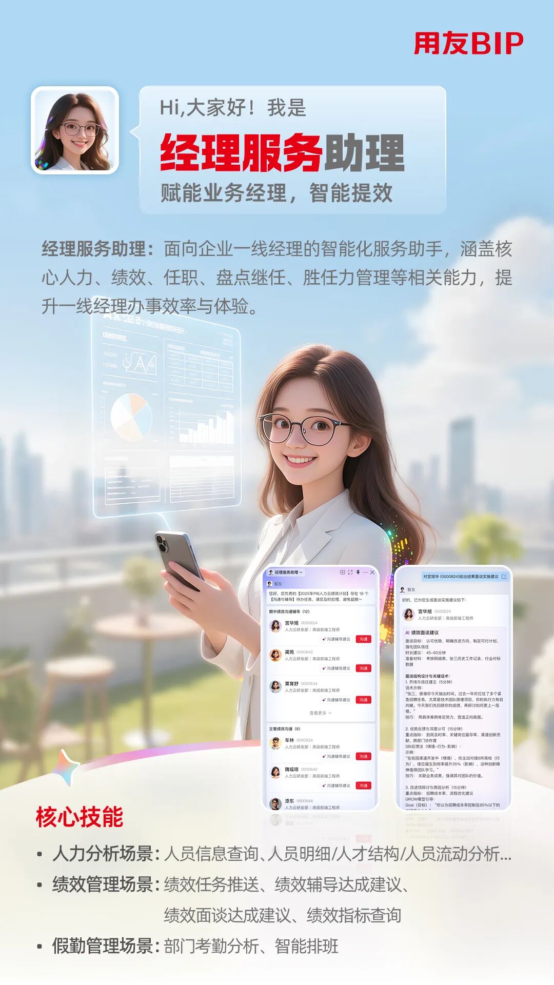 经理服务助理与员工服务助理,以“用户为中心”重构了人力服务的交互模式,搭建起 面向业务经理、员工的人力服务桥梁。