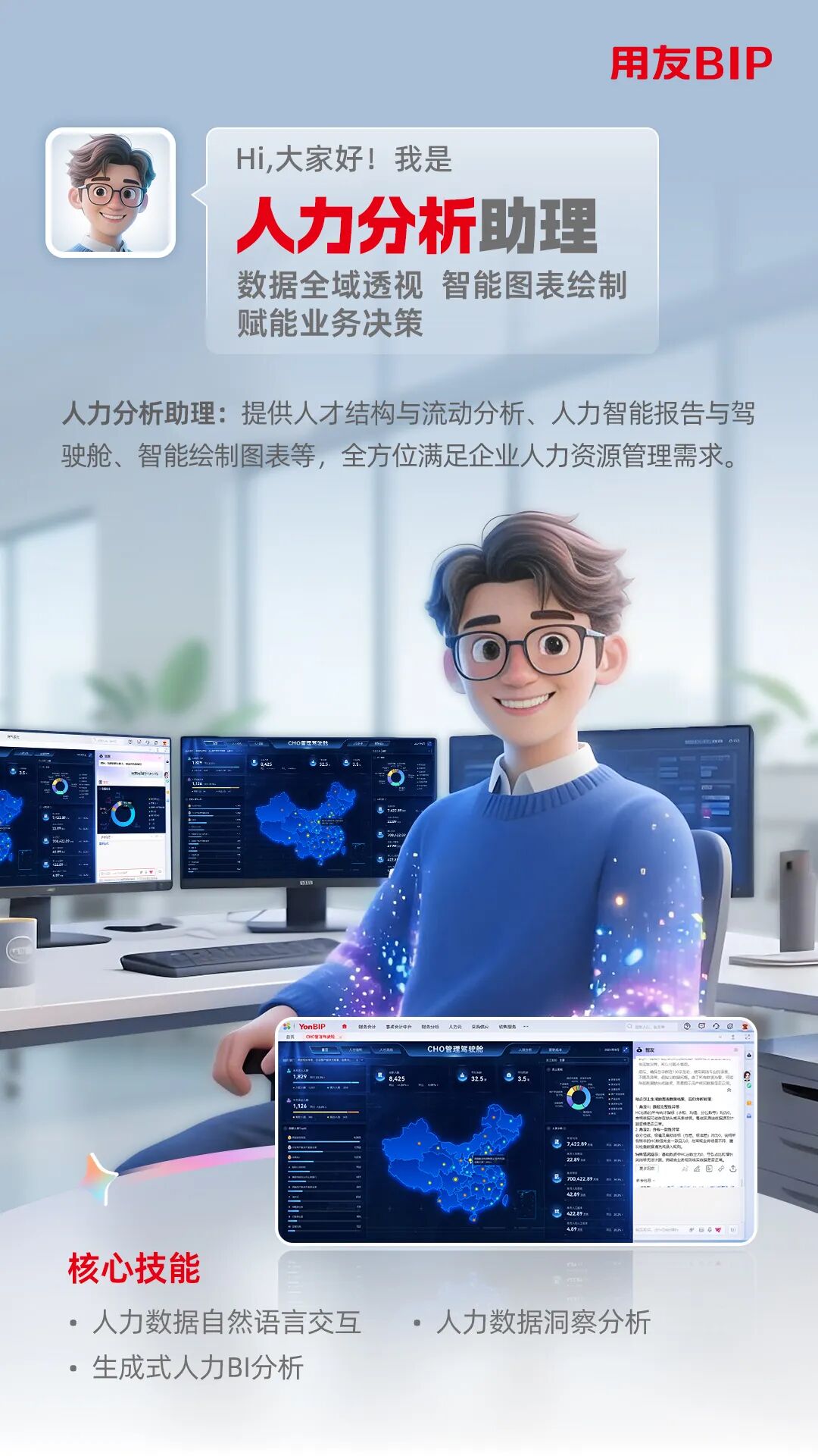 从业务场景的流程重构,到数据价值的深度挖掘,再到交互体验的全面升级,用友BIP人力智能体并非孤立存在,而是形成了“事务处理 - 数据支撑 - 服务协同”的完整闭环。它们不仅解放HR的双手,更重塑了人力管理的价值边界,成为企业提升组织效能、激活人才潜能的核心竞争力。