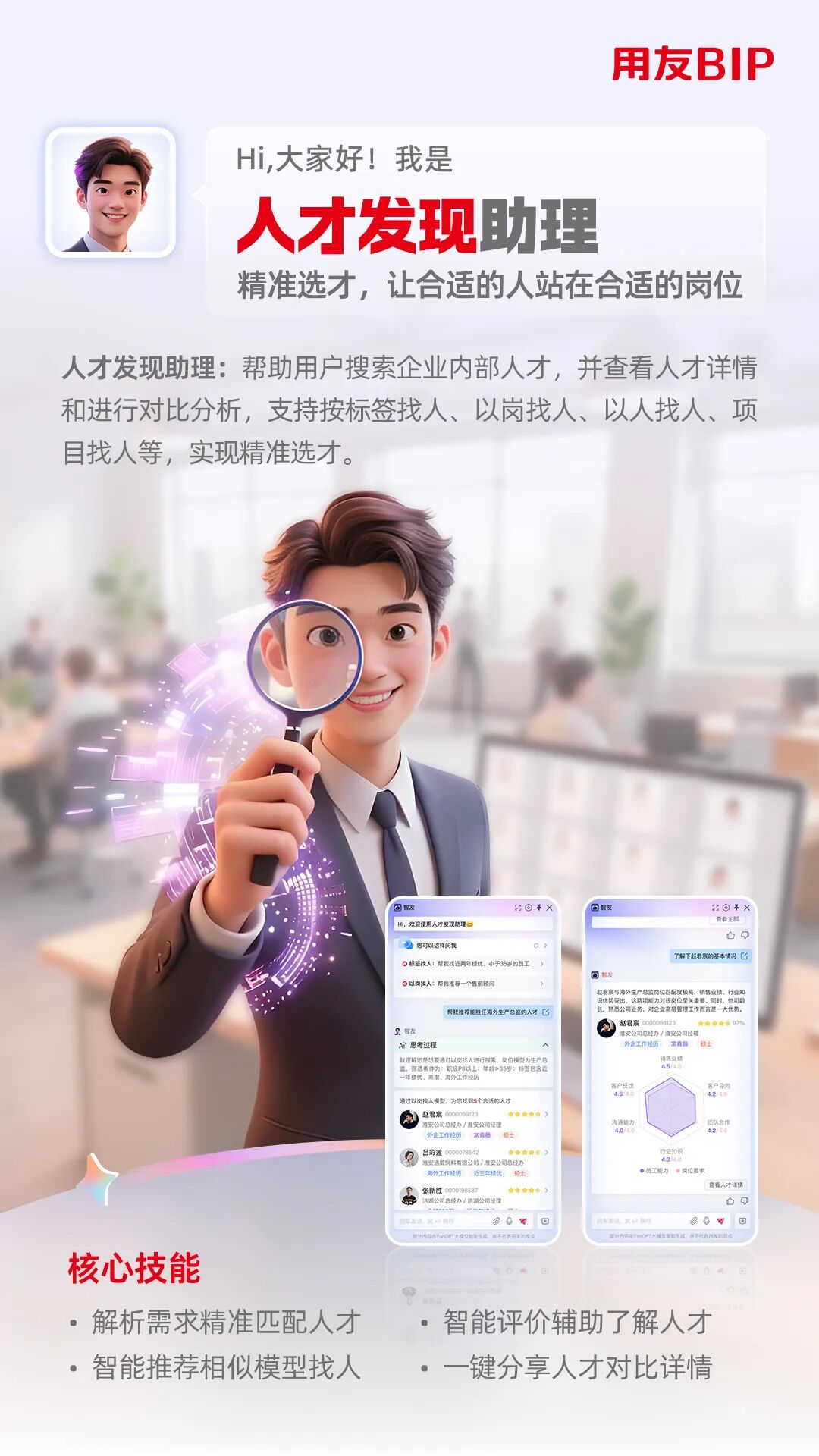 人才发现助理依托大模型、智能搜索引擎与自然语言处理技术,精准解析企业人才需求,实现人才精准识别与推荐。将人员基本信息、能力素质、人才标签及项目信息等为检索范围,通过自然语言交互智能匹配相似模型或生成新岗位模型,完成人才精准匹配、综合评价与对比分析,一键分享至用人部门,形成从需求解析到应用落地的人才管理闭环,打破了传统人才选拔依赖主观判断的局限,实现“让合适的人站在合适的岗位上”。
